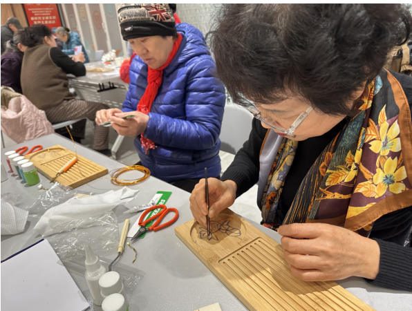 只见老东谈主们戴着老花镜,防御翼翼地将铜丝掐成细致图案,或用彩沙填充点缀。在宋锦制作区,老东谈主们将剪辑好的锦片按照传统纹样拼贴,再将珍珠点缀其间。“这可比看电视有趣味多了!”步履现场飘溢着欢声笑语。